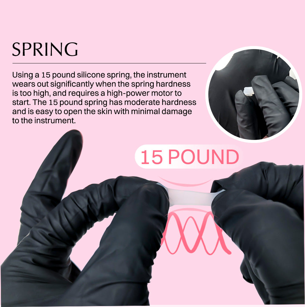- Uses a 15 lb silicone spring for balanced hardness, ensuring smooth skin penetration with reduced motor wear.