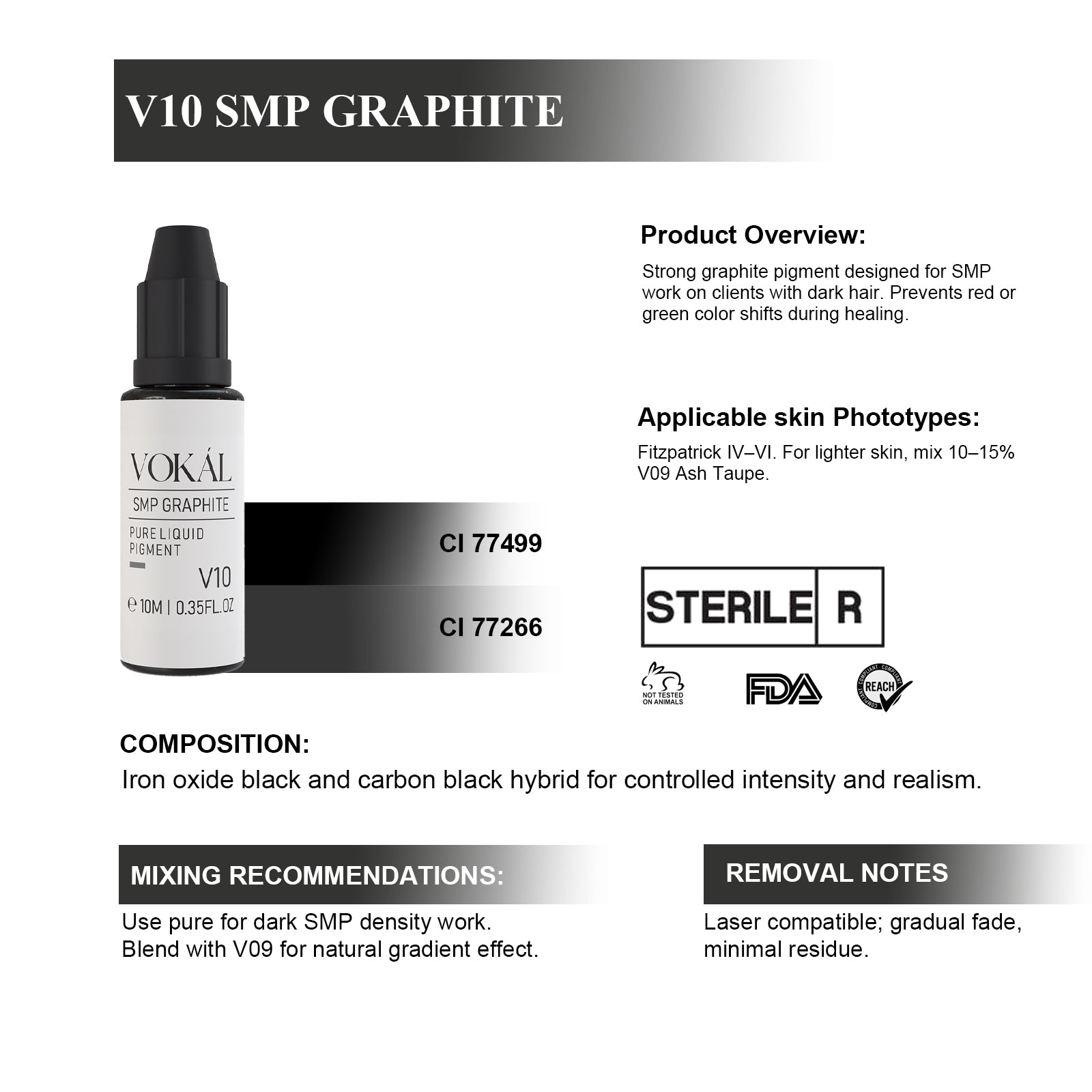 VOKÁL™ V10 SMP Graphite is a professional-grade Scalp Micropigmentation (SMP) pigment crafted for artists seeking deep, realistic follicle replication on clients with dark hair and medium-to-deep skin tones. Its rich graphite base ensures true-to-tone results—without unwanted red or green hue shifts during healing.